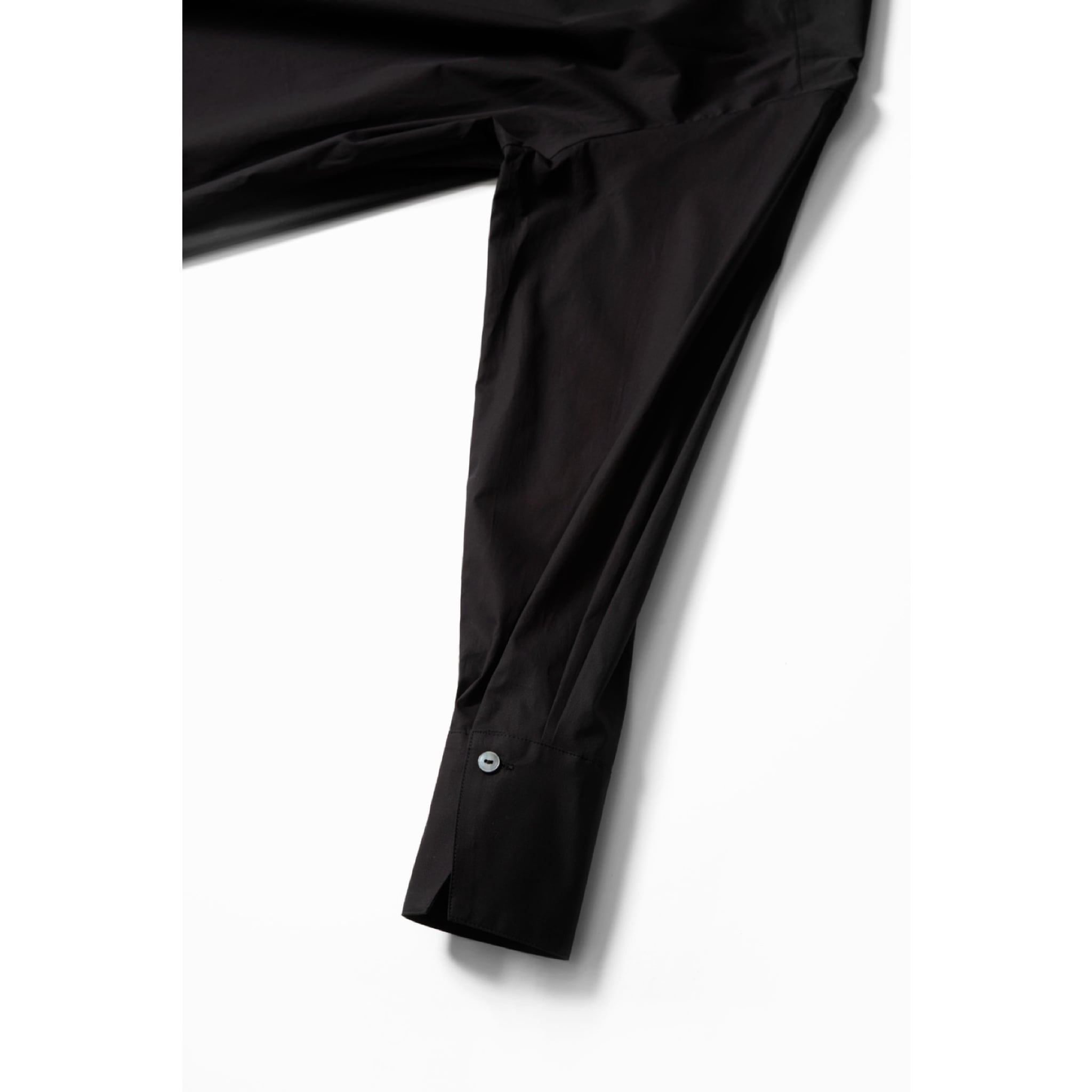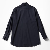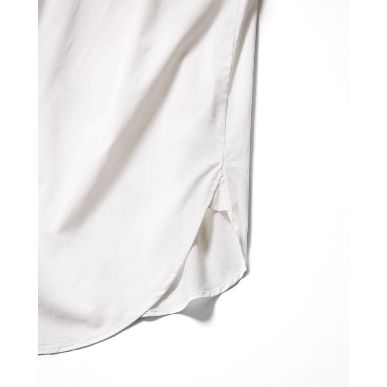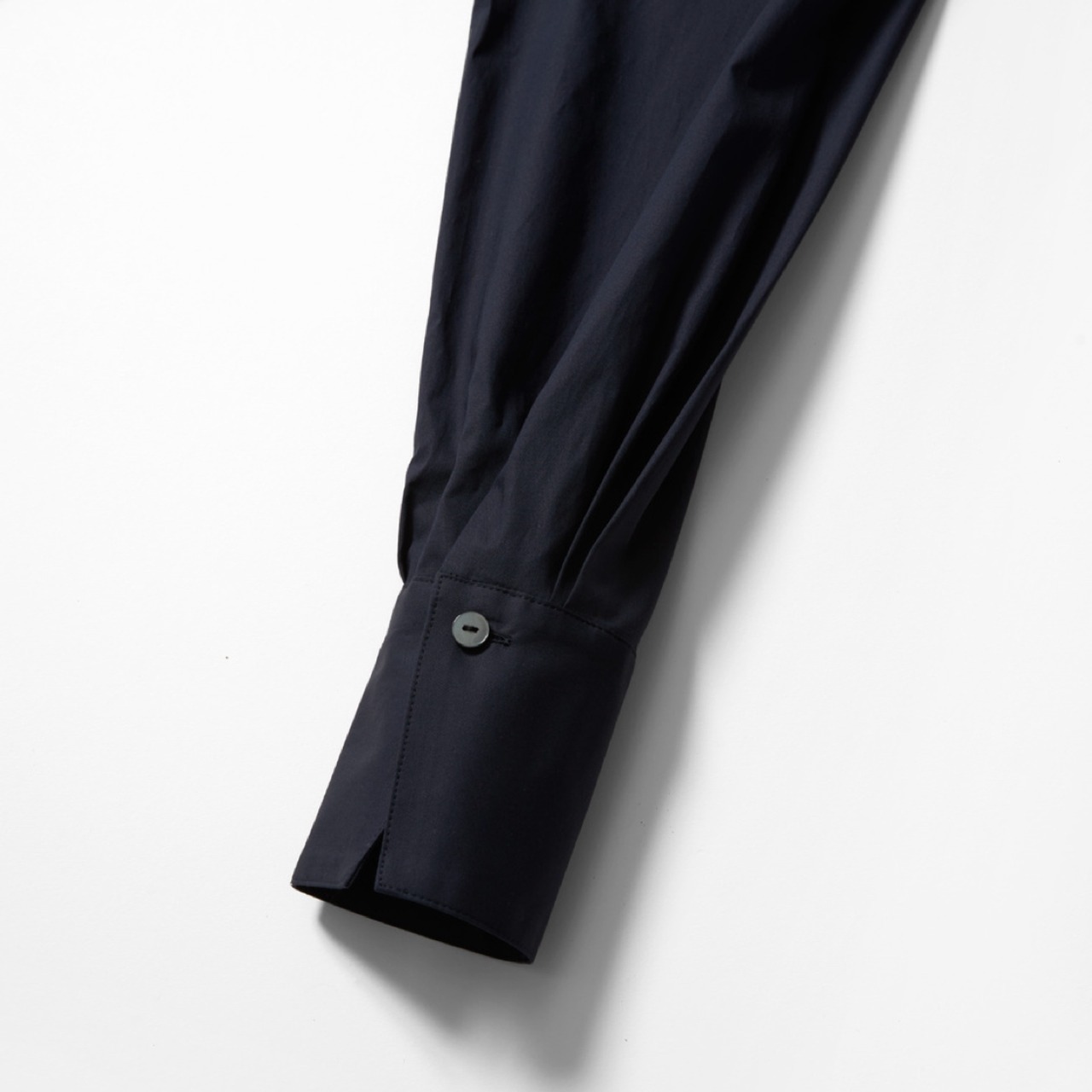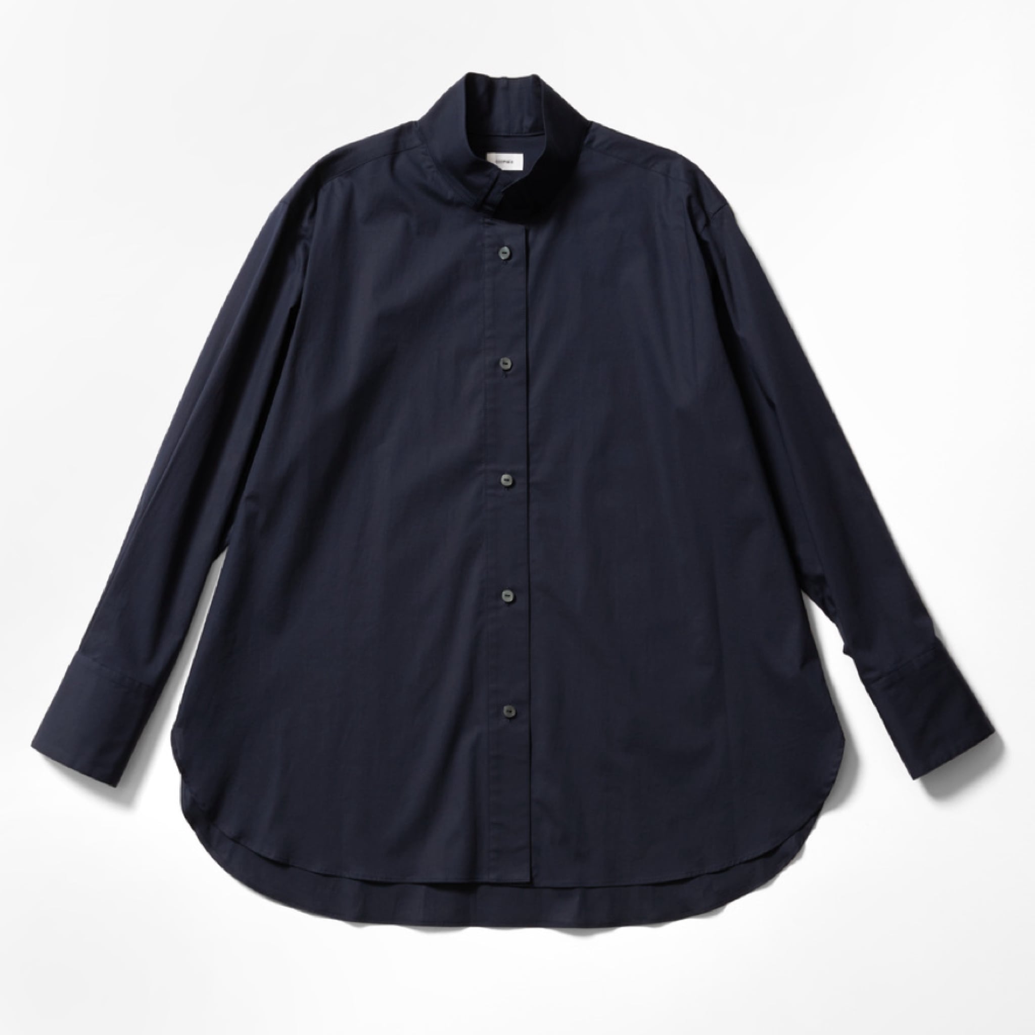 長めの着丈はボトムスからoutした時に前から見るとストレートシルエット、横から見るとAラインのシルエットになります。女性らしいカーブを描く裾回り、カフス部分を折ったときに出来る女性らしい袖口の形、首元にスカーフを通した時にマニッシュと可愛いもバランスが取れるように…襟をたおしたらテーラード襟の形に。