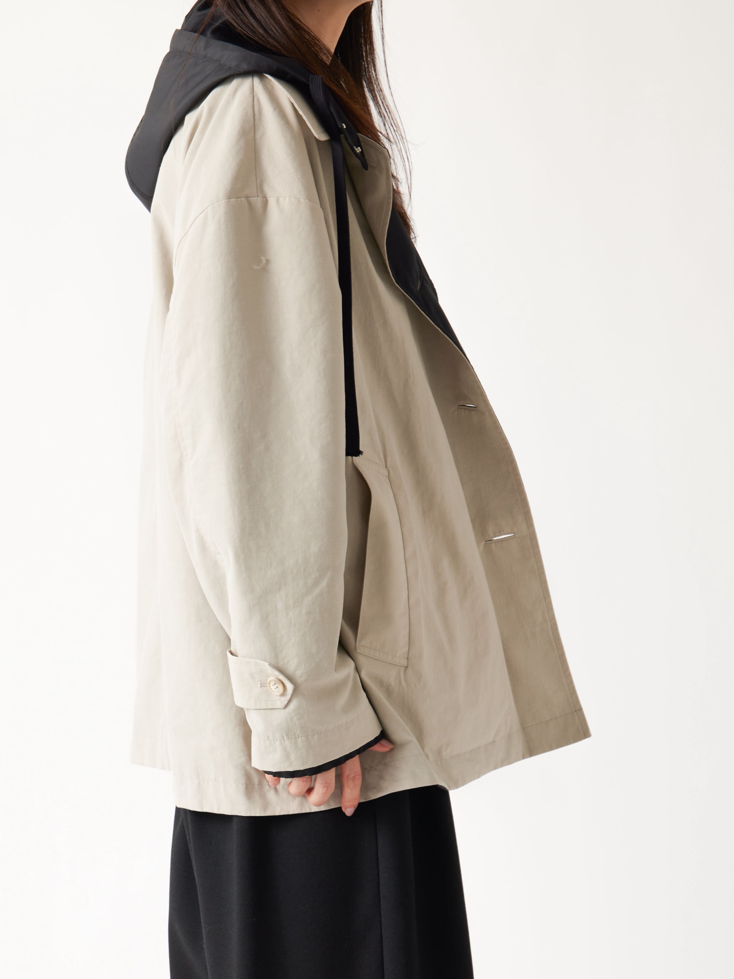 暖色になり過ぎない絶妙なトレンチカラーと黒のバイカラーを楽しめるリバーシブル仕様です。(黒の生地はマウンテンパーカーと同じ生地を使用)